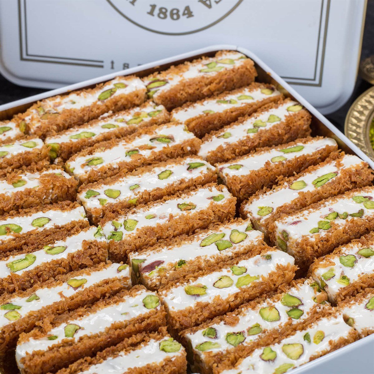 材料: トルコ風ロクム(水、砂糖、コーンスターチ、レモン汁、ピスタチオ、バニリン、ソープワート抽出物)、カダイフ(シロップ入り小麦粉、水、ギー、水素添加植物油、レモン汁、砂糖)