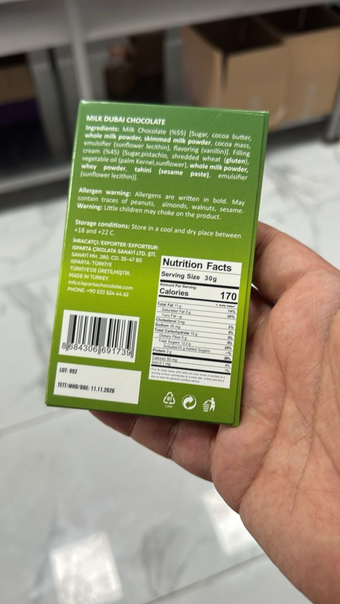 この傑作は、濃厚で贅沢な層のベルベットのようなピスタチオクリームを特徴としており、豊かでナッツの風味があふれています。この滑らかなフィリングには、カリッと黄金色に焼き上げたカダイフ(カタイフィ)ピースがたっぷり詰まっており、本物のドバイチョコレートを定義するシグネチャーのカリカリクリーミーな食感を生み出しています。これらすべてがBiDuのシグネチャーである濃厚なミルクチョコレートで包まれています。
