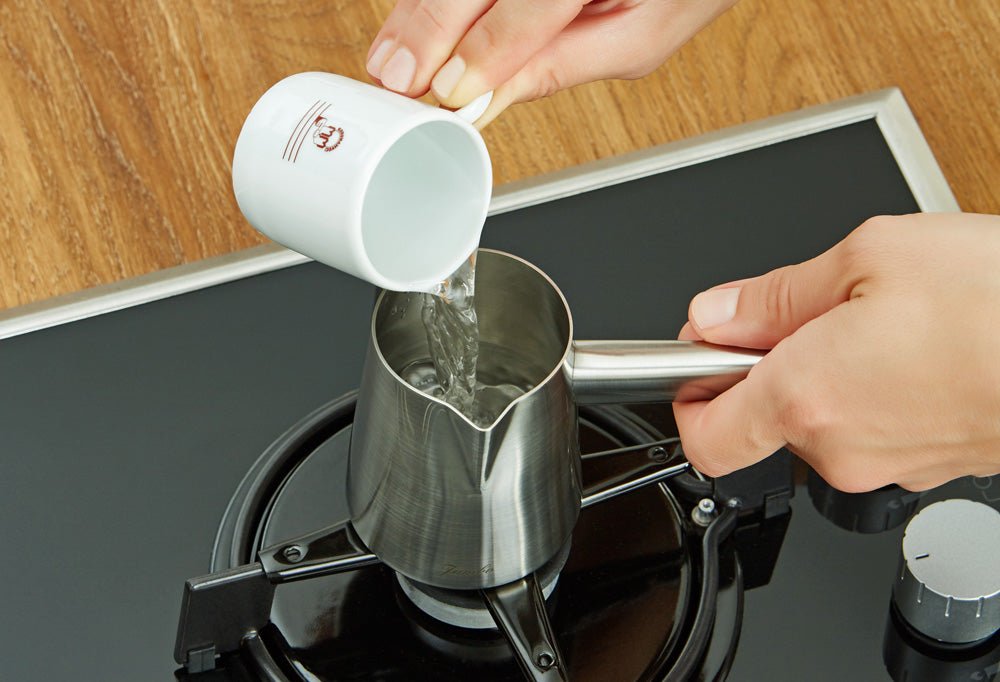 65mlの水に対して5-6グラム(1.5ティースプーン)のコーヒーを使用してください。水を入れて 鍋に入れて 弱火。 水にコーヒーとお好みの量の砂糖を加え、ゆっくり混ぜます。 一度 コーヒーは時間が経つにつれて泡立ちますので、泡をカップに注ぎます。その後、残りのコーヒーをさらに煮立てて、残りをカップに注ぎます。