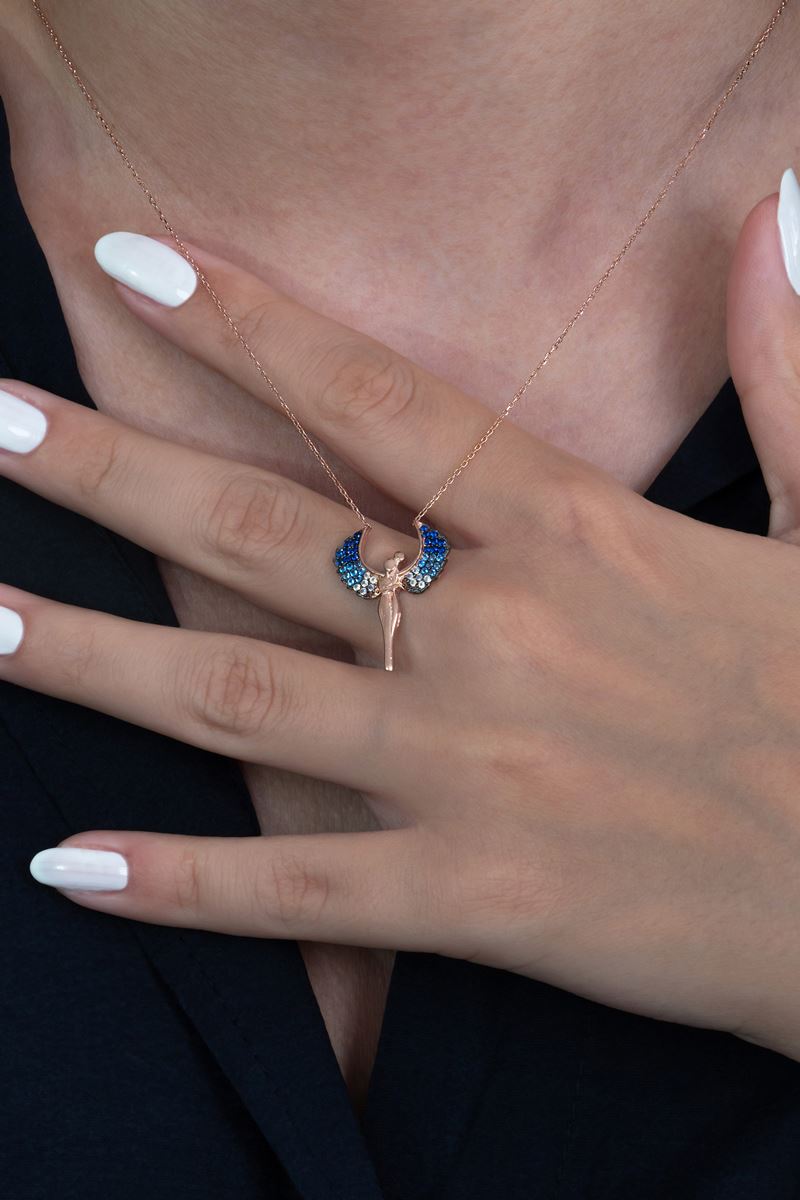 Taki | Hugging Couple Silver Necklace with Blue Stone Michael Angel Wings - TryAladdin